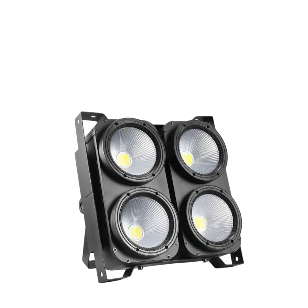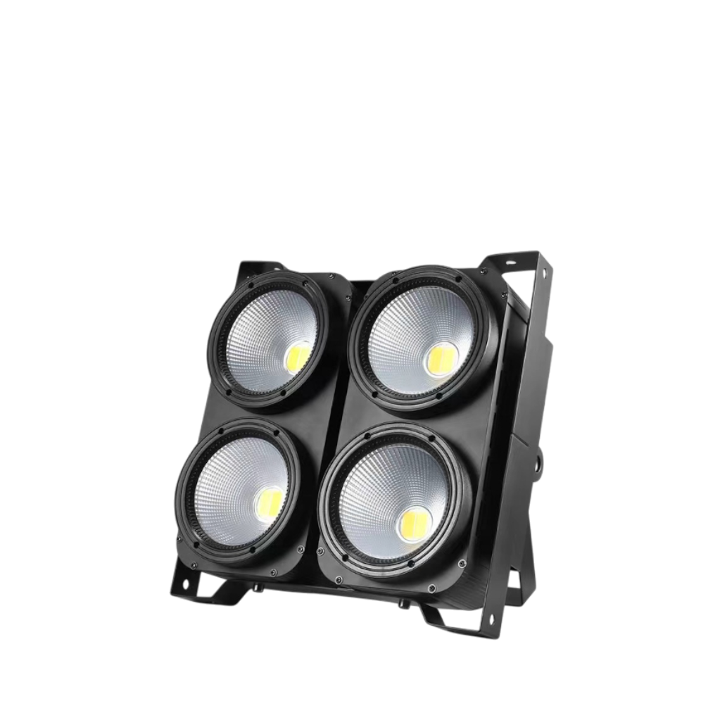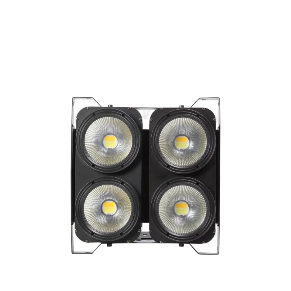 Blinder LED profesional de alta potencia diseñado para iluminación de público, escenarios y eventos. Cuenta con 4 LEDs de 100W de doble color Warm White + Cold/Neutral White, ideal para efectos tipo blinder, flashes y baños de luz potentes y parejos.