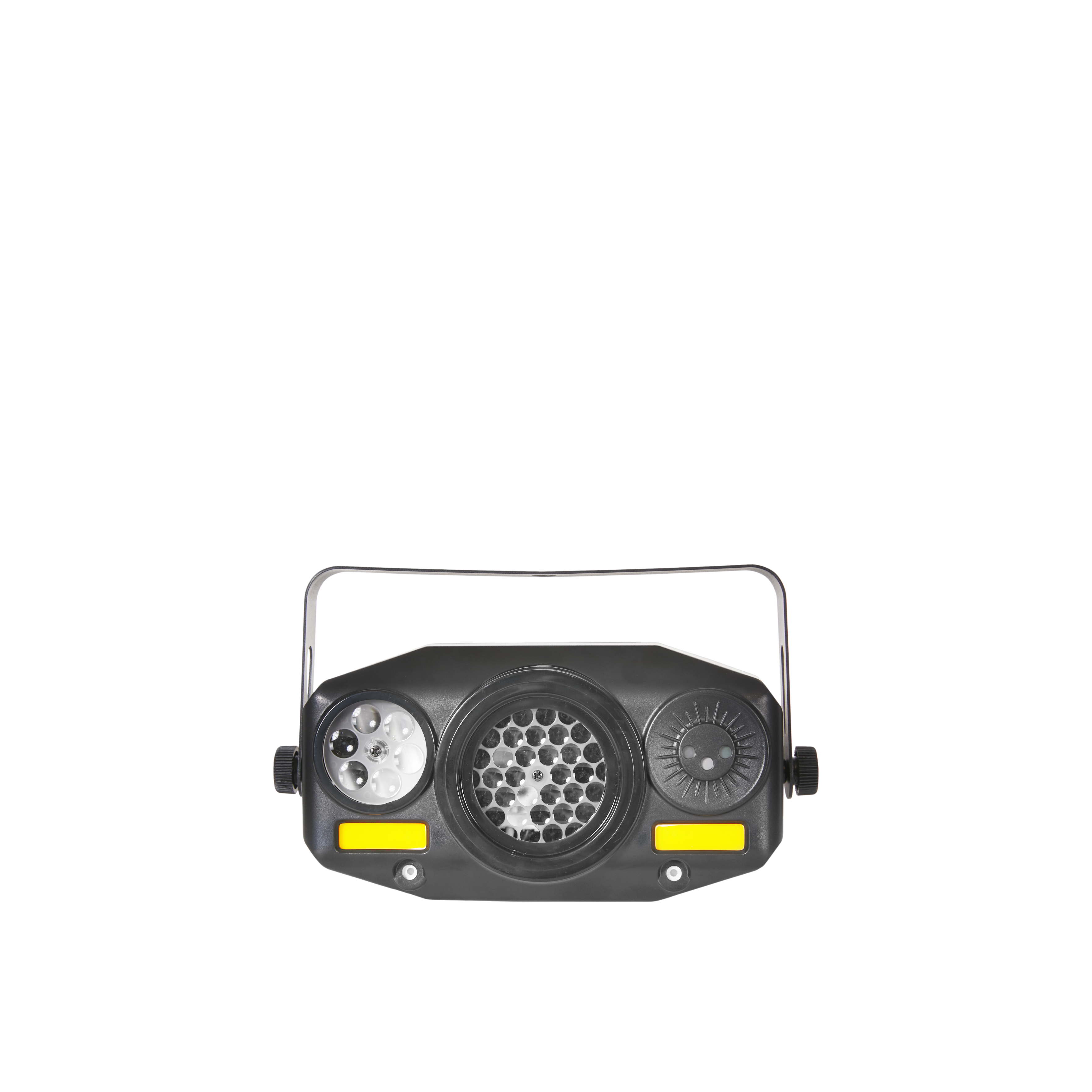 Equipado con LEDs monocromos de alta intensidad, el CRASH ofrece haces definidos y colores vibrantes, acompañados de efectos kaleidoscópicos de rotación infinita y patrones dinámicos que aportan movimiento constante a la escena. A esto se suma un sistema de láser rojo, verde y azul, junto con strobes de alto brillo, creando capas visuales que enriquecen cualquier show.